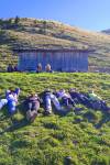 Bereits der Aufstieg zur Hütte war eine große Herausforderung, denn die Lebensmittel für die gesamte Zeit mussten auf die ohnehin schon schweren Rucksäcke aufgeteilt werden, was sich allerdings als einfache Übung herausstellte: Jeder nahm sich ganz selbstverständlich so viel Gruppengepäck, wie er tragen konnte und war stolz darauf, wenn er besonders viel für die Gruppe schleppen konnte. Und so gingen einige mit einem Blumenkohl unterm Arm und Lauch im Rucksack los, andere trugen Taschen voller Brotlaibe hinauf zur Hütte.
